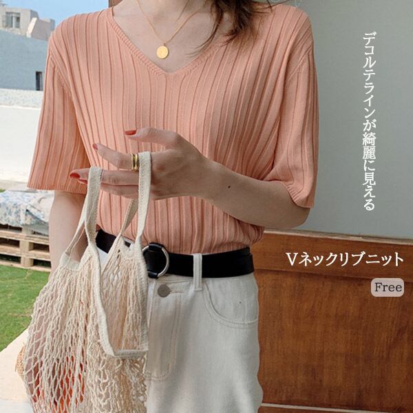 デコルテラインがきれいに見える Vネックリブニット